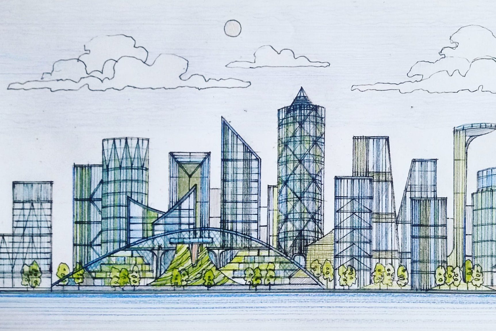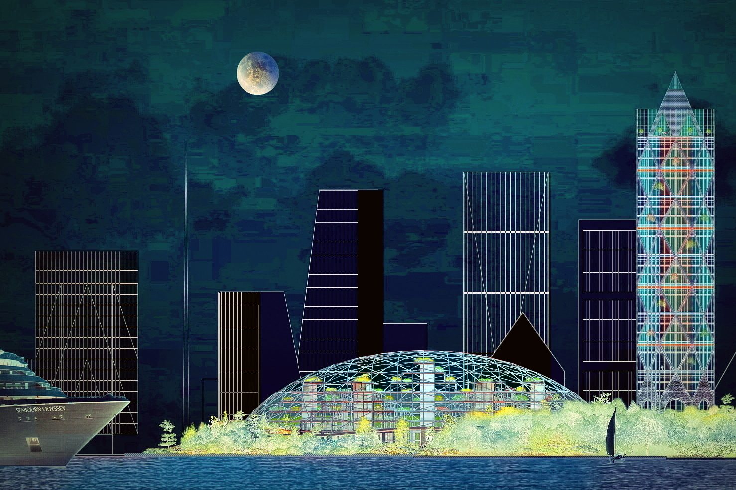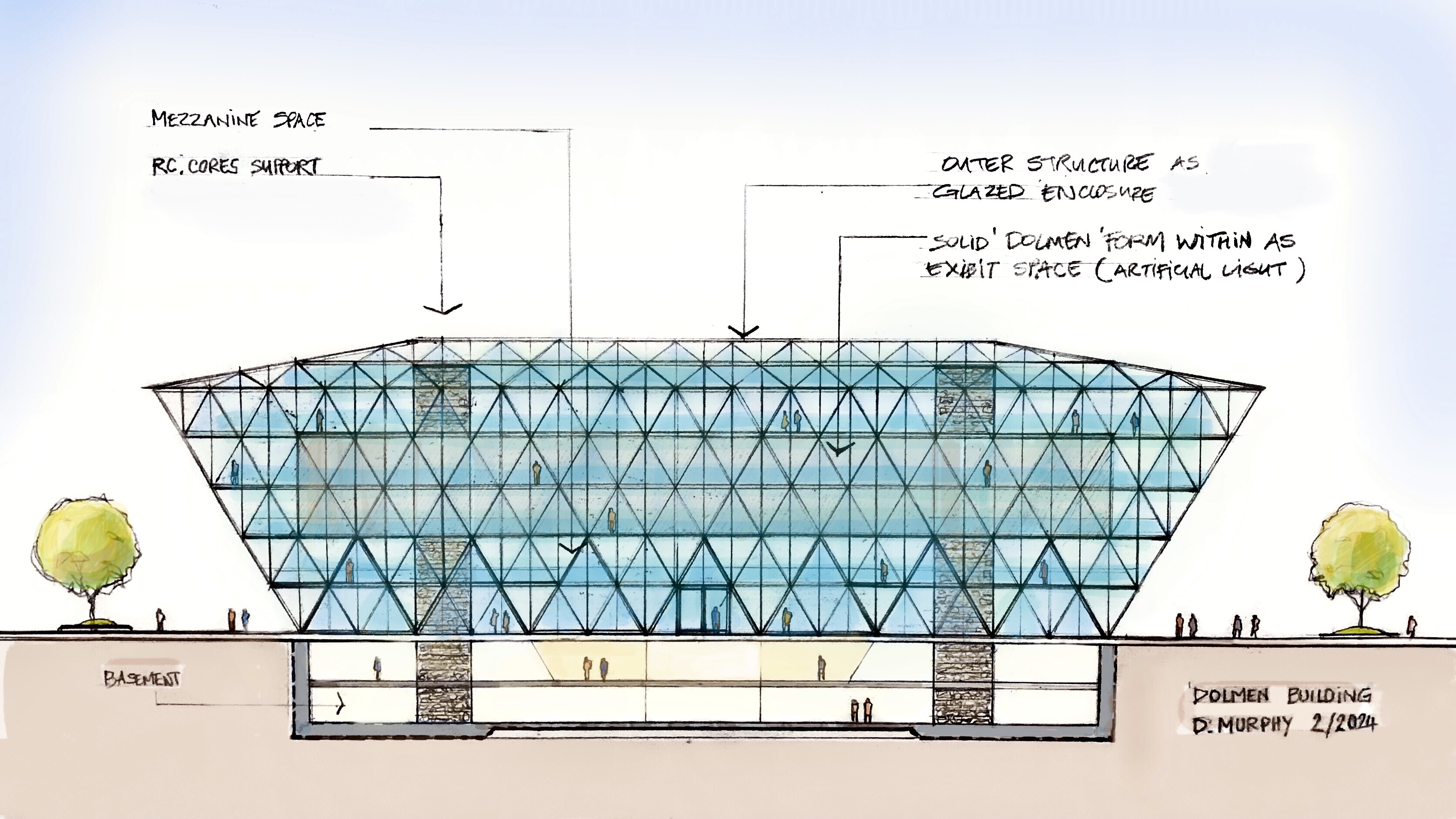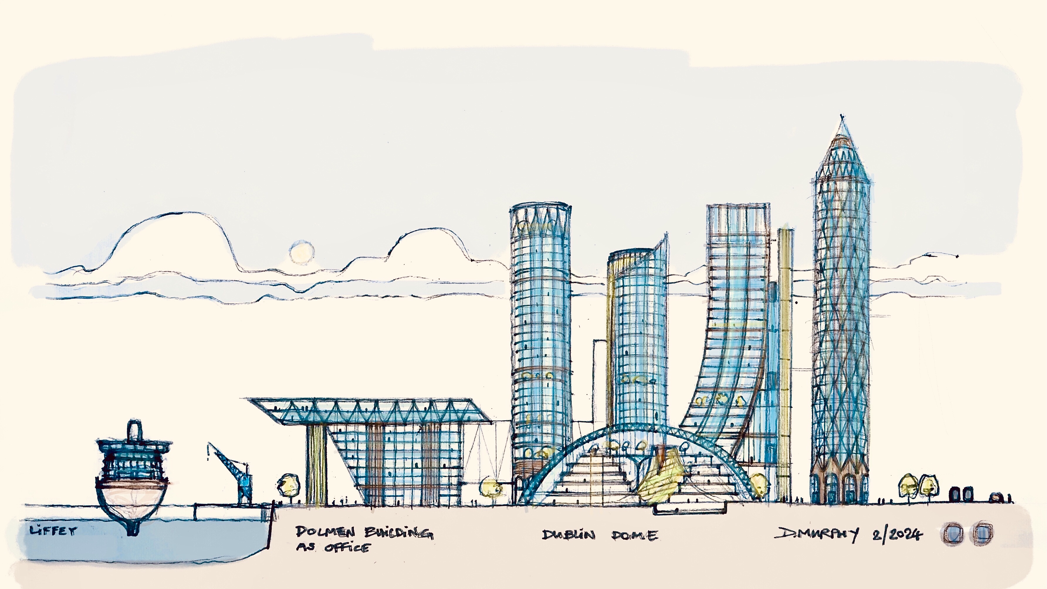 Design proposals for a Retail Destination – ‘Dublin Dome’, and a Landmark ‘Round Tower’ building, were previously published in 2017 and 2019. These were followed by contextual sketches in 2019 / 2020 suggesting a location in Alexandra Basin which were in illustrative form. The intention was to eventually produce something more coherent, which would put the Round Tower and Dublin Dome proposals in a proper context and also to suggest my personal view of the true potential for Alexandra Basin. These Proposals are influenced by frequent visits to Marina Bay in Singapore between 2012 and 2016. Alexandra Basin is a similar opportunity in my opinion, with potential for a mixed use CBD and a sense of enclosure arising from the pre existing shape of Alexandra Basin. Luas , Rail lines and Port Tunnel link to Airport are in situ nearby. River taxis can be introduced to link with City and coastal suburbs.