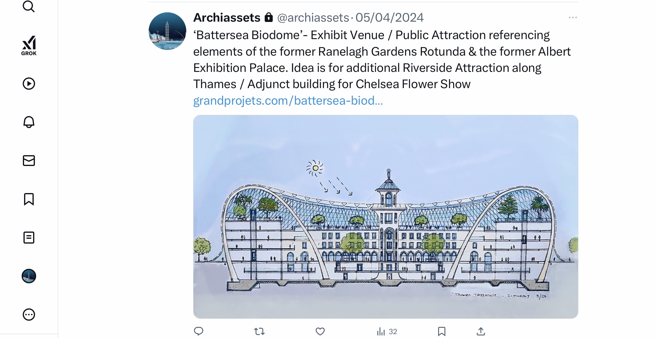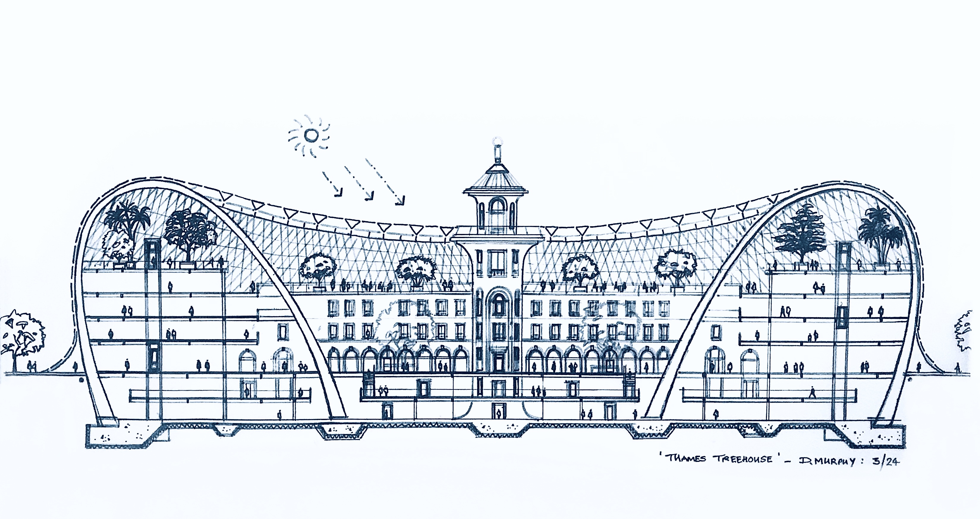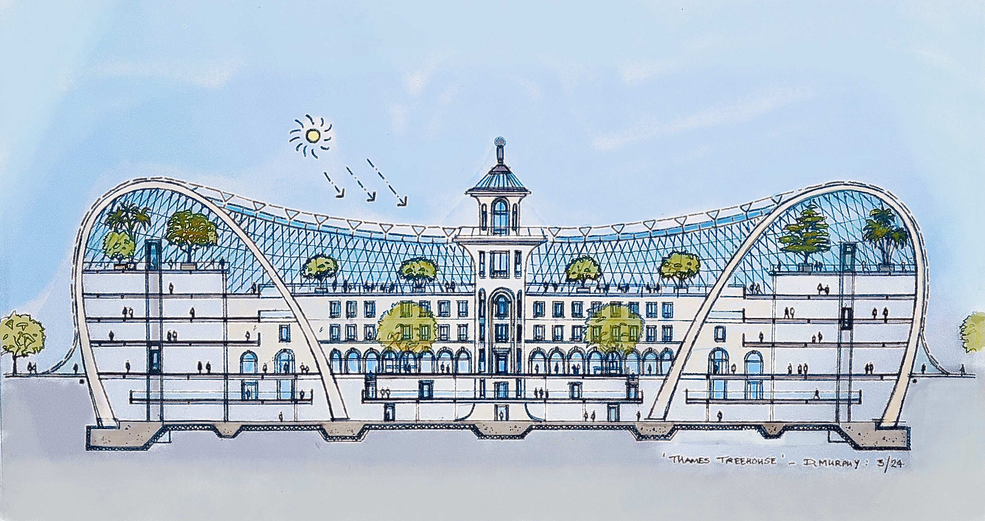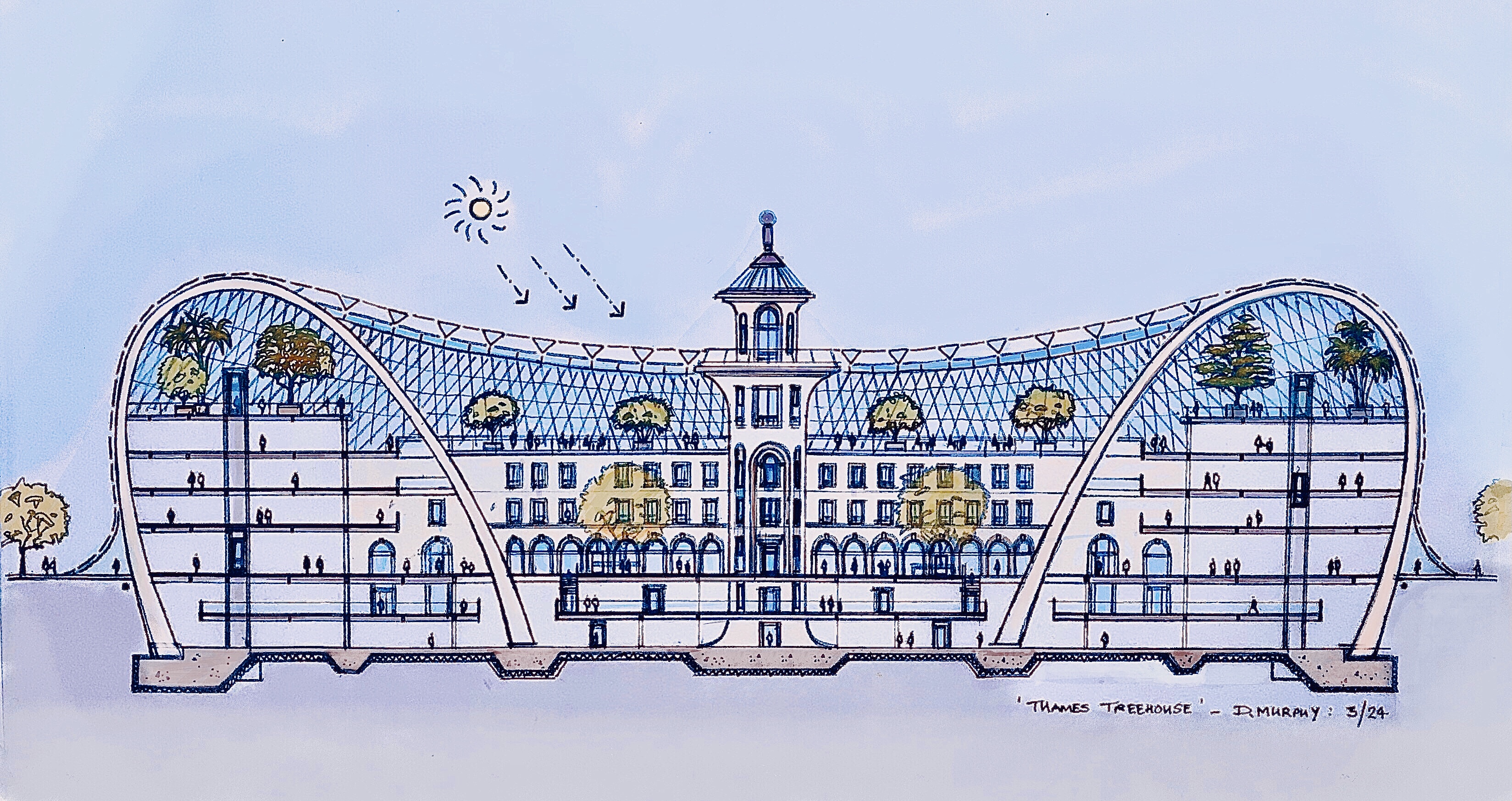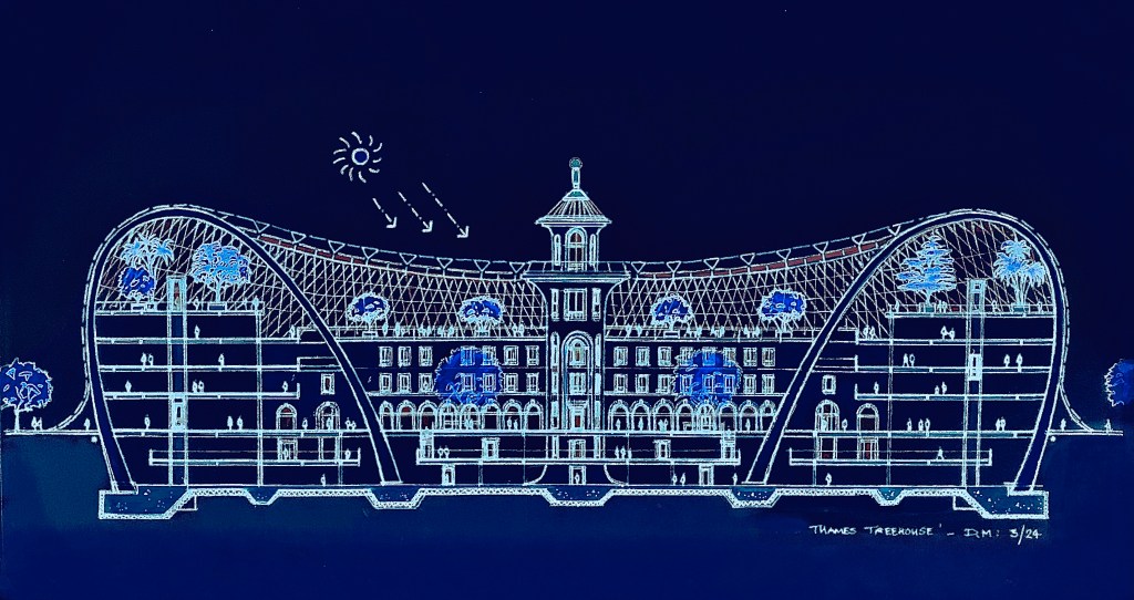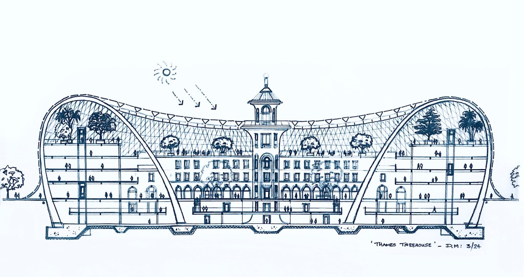 Cross Section Drawing through proposed Battersea BioDome enhanced by GrokCross Section through Proposed ‘Battersea ‘Biodome’ / ‘Thames Terrarium’ Building. Suggested Location : Battersea Park Promenade / Thames Riverside area