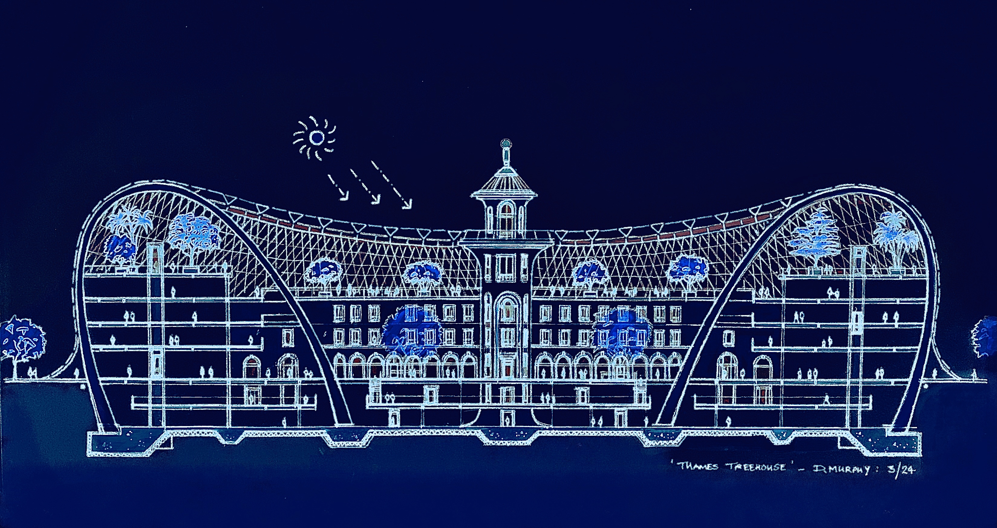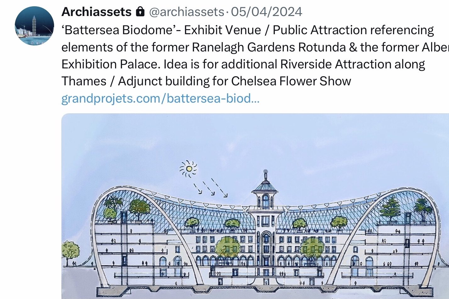 ‘Battersea Biodome’ Exibit Venue / Public Attraction referencing elements of the former Ranelagh Gardens Rotunda & the former Albert Exibition Palace. Idea is for an additional Riverside Attraction along Thames / Adjunct building for Chelsea Flower Show, and to be Congruent with the Thames Illuminated River Project.
