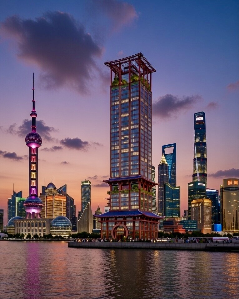 Traditional Chinese Architecture ( Street Level + Sky Gardens ) + Modernist Glazed Skyscraper = Interesting Hybrid