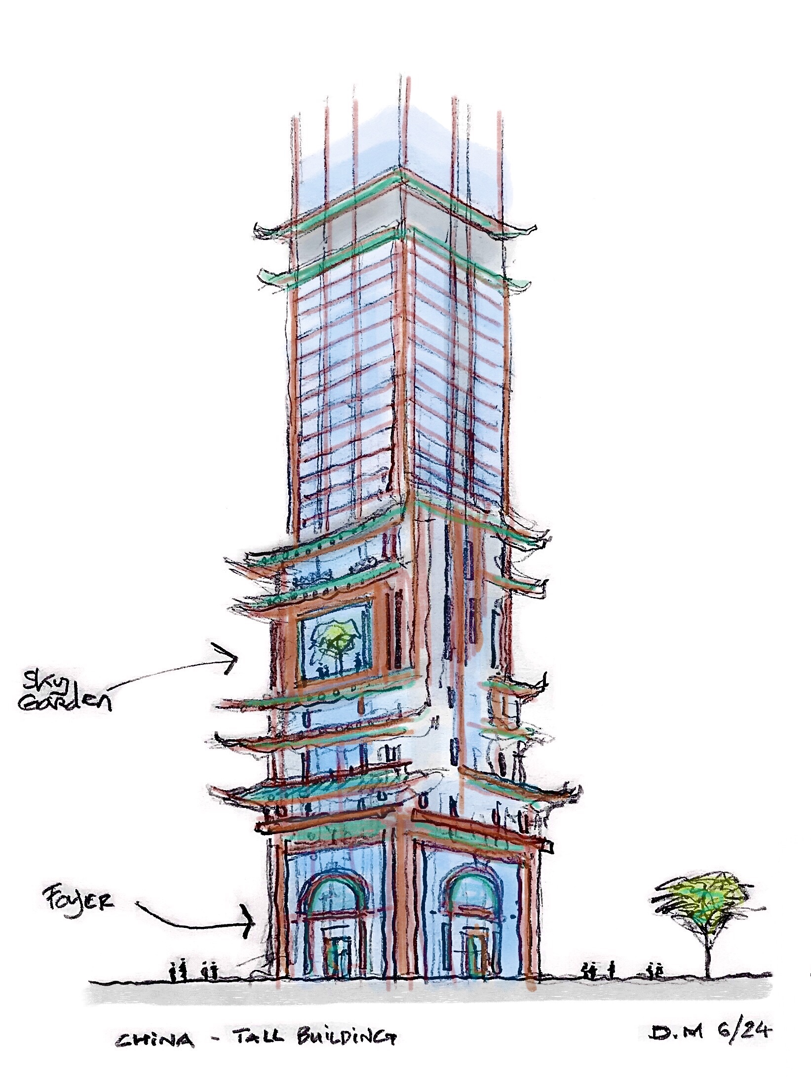 Traditional Architectural Treatment to ~ 4-6 Storeys above Street Level ( Foyer / Concourse / Undercroft etc ). Yuan shaped Entrance to Semi Public Foyer space. Cafe / Dining to street level. Office Floor Levels with Traditional Motifs to Fenestration / Fritted Glazing etc. Traditional Chinese Architectural Treatment & Gardens to Accentuate Sky Terraces & Disguise MEP Floors