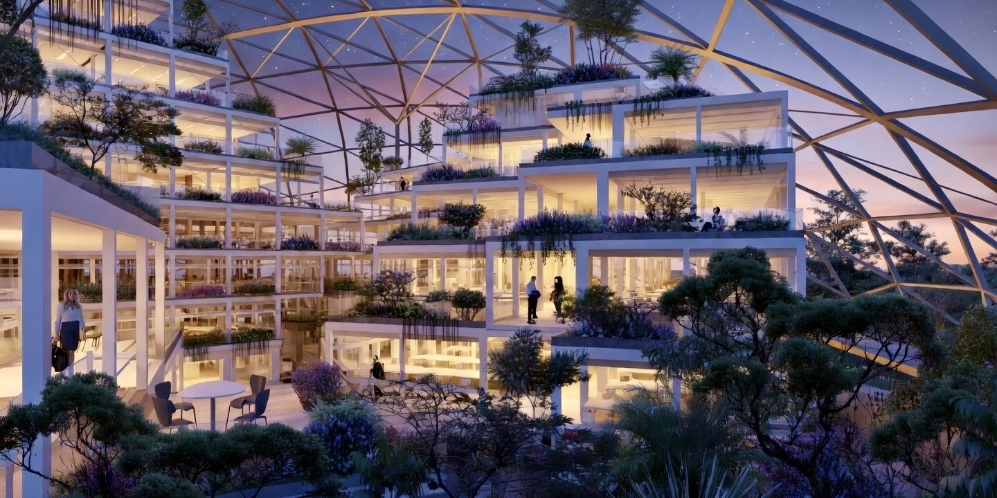 Gridshell Ovoid Shaped Dome of between Circa 100m x 150m Axial length. Biome likely to be Composite Structure comprised of Steel or Glue Laminated Timber Gridshell sections supported by a Steel Superstructure. Steel Superstructure might be comprised of Tree Shaped Steel Mega Columns or alternatively Arch shaped Bolt Box Steel Trusses with a Triangular shaped sectional profile, spanning between R.C. Buttress walls or a Reinforced Perimeter Ground Beam. Glazed Gridshell Roof to be composed of Triangular Sections or Larger Hexagonal Sections.
