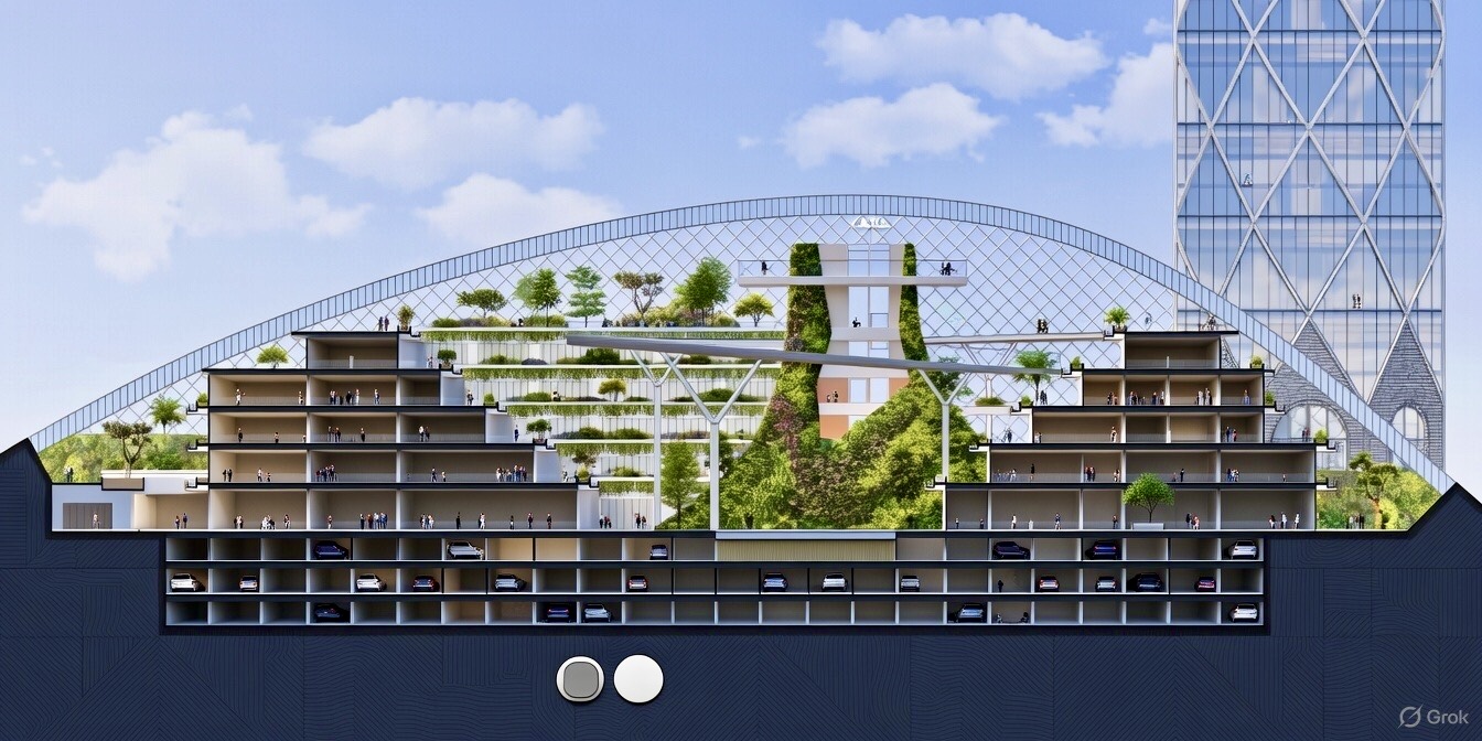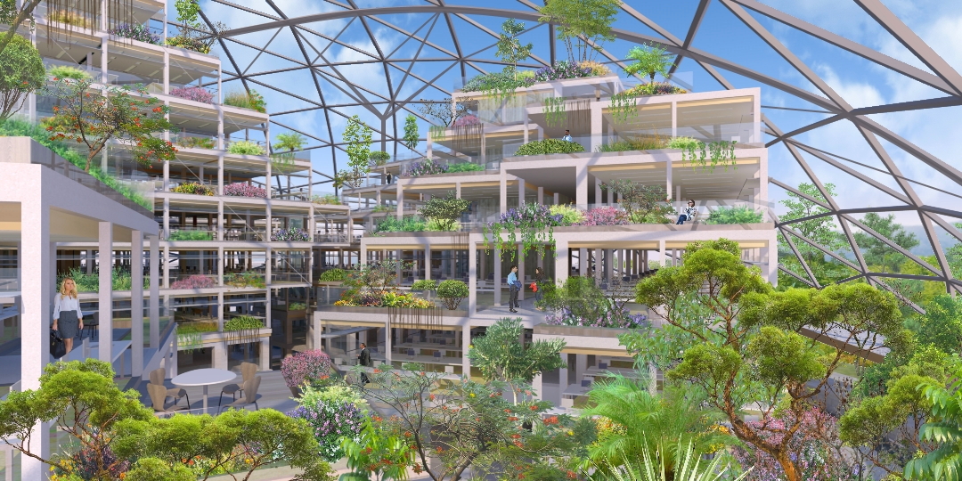 BioDome to be 5 to 6 Storeys over Ground Level with from 1 to 3 Basement Levels. Separate Steel or braced R.C. Superstructure to support Pedestrian ‘SkyWalk’ spanning between upper Floor Levels. Climate Controlled Environment condusive to Plant Growth. Planted Central Feature with recirculating Irrigation System and shallow moat Water feature as surround. Continuous Planted Wall / Embankment Water Feature to Perimeter at Ground Floor Level maintained by Irrigation System.