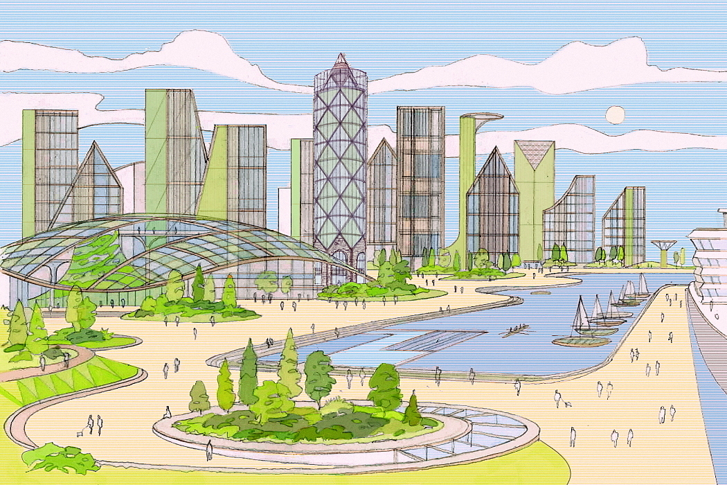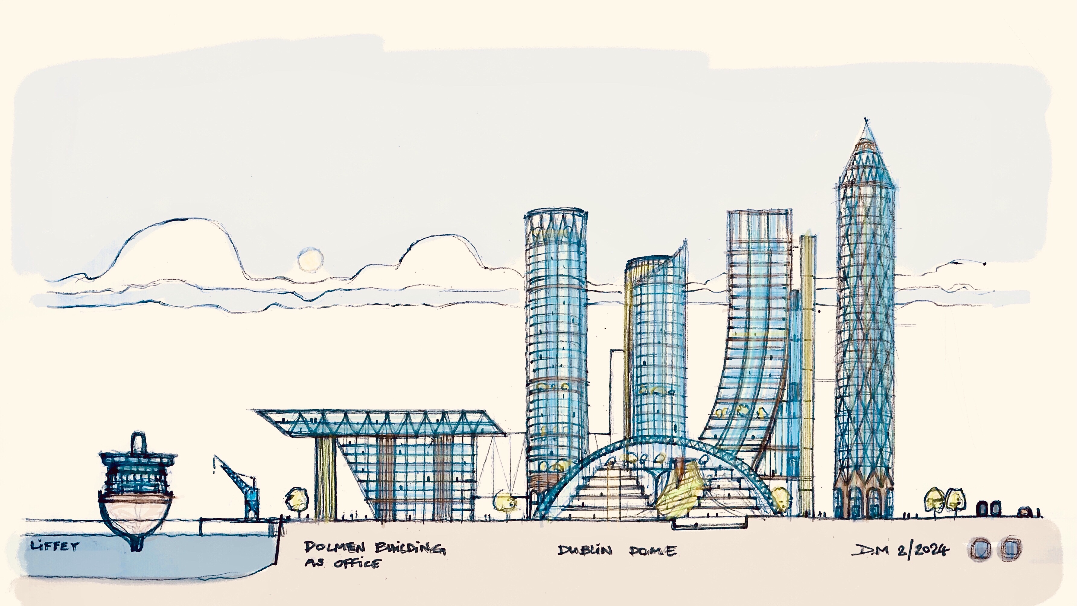Proposal for a New South Facing CBD to Alexandra Basin, Dublin Port incorporating Feature Buildings such as Round Tower Signature Building, ‘Ship Building’ Geodesic Biodome. Influenced by time spent in Marina Bay Singapore between 2012 and 2016.