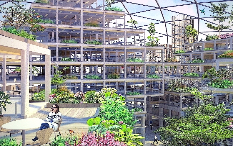 Gridshell Ovoid Shaped Dome of between Circa 100m x 150m Axial length. Biome likely to be Composite Structure comprised of Steel or Glue Laminated Timber Gridshell sections supported by a Steel Superstructure. Steel Superstructure might be comprised of Tree Shaped Steel Mega Columns or alternatively Arch shaped Bolt Box Steel Trusses with a Triangular shaped sectional profile, spanning between R.C. Buttress walls or a Reinforced Perimeter Ground Beam. Glazed Gridshell Roof to be composed of Triangular Sections or Larger Hexagonal Sections.