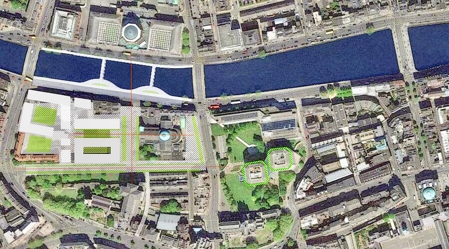 The Proposal Illustrates the Potential Enclosure of the Courtyards at the Four Courts by Glazed Gridshell Structures. These Enclosures might facilitate a Reconfiguration of the circulation within the Building and thus the Adaptive Reuse of the Building from Courts Building to Museum at some point in the Future. Such Future Spaces might be multifunctional – Public Performances, Lectures, Events, Exhibitions etc. The removal of existing trees is suggested in order to enhance the view of the Four Courts Facade. Bridge Links are also explored along with Potential for a Masterplan to Merchants Quay.