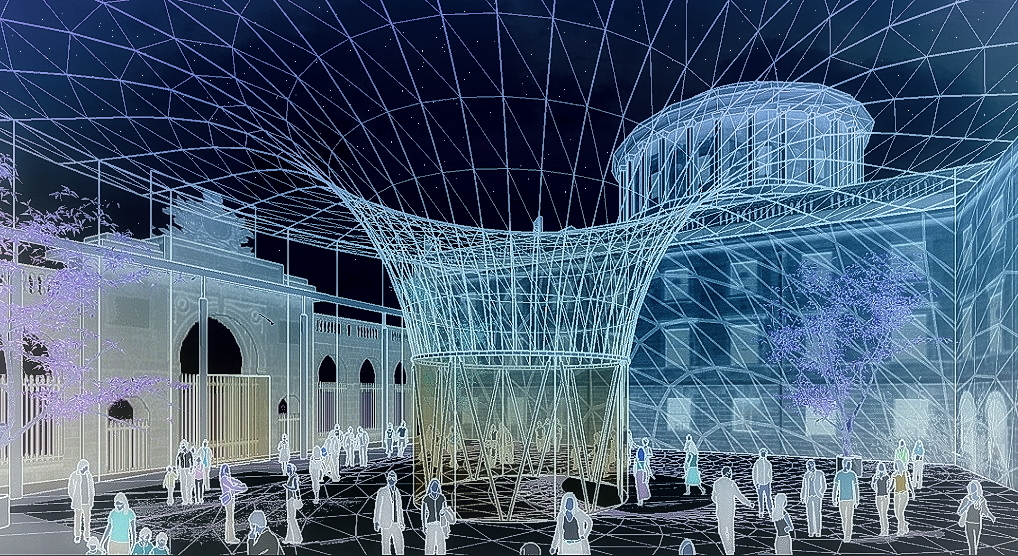 The Proposal Illustrates the Potential Enclosure of the Courtyards at the Four Courts by Glazed Gridshell Structures. These Enclosures might facilitate a Reconfiguration of the circulation within the Building and thus the Adaptive Reuse of the Building from Courts Building to Museum at some point in the Future. Such Future Spaces might be multifunctional – Public Performances, Lectures, Events, Exhibitions etc. The removal of existing trees is suggested in order to enhance the view of the Four Courts Facade. Bridge Links are also explored along with Potential for a Masterplan to Merchants Quay.