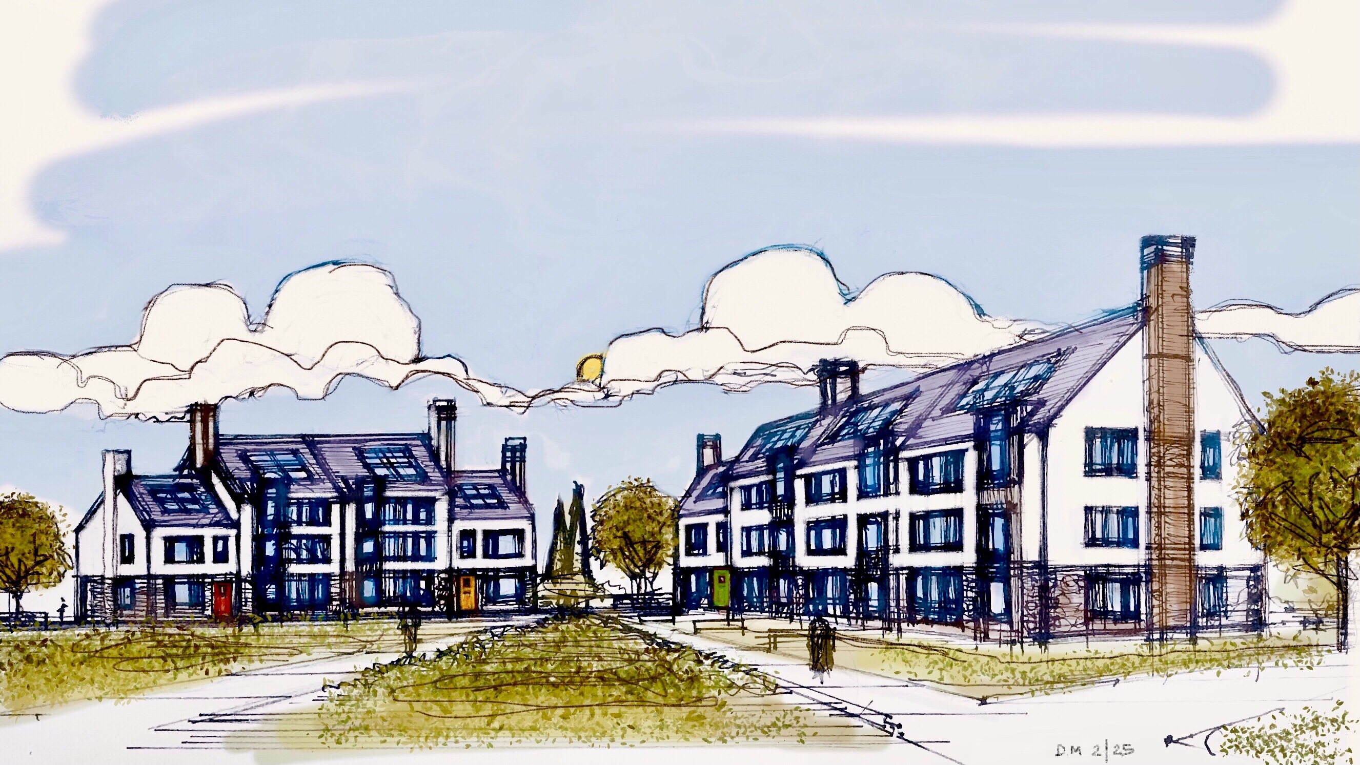 Apartment Blocks would be Orientated East West where possible to ensure the Apartment Living Areas are facing the Sun. Apartment Block Heights range from 3 to 4 Storeys. Rule of Thirds = Visually pleasing Hierarchy : Pitched Roof + MidSection + Base. Balcony Area to Eastern / Southern / Western Aspects. Minimum Glazing to Northern Elevations. Roof Pitch from 35 to 50 degrees. Pitched Roofs essential to Aesthetic & allows for Proven Weatherproofing & Solar Array. Appropriate Fire stopping required between Units at Roof level. False Chimney conceals Exaust Air / SVPs. Contemporary Glazing.