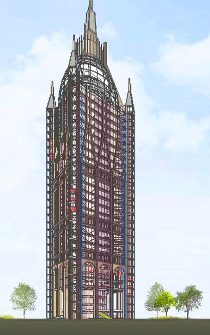 Access for Public to SkyGarden via Glazed Elevators at corners enclosed by Stone / Glass Clad Buttresses offering 2 way viewing Experience & presenting a Jewel like effect at night. The Building would be continuously animated by two-tier coloured elevators, rising from a ground level undercroft to a glazed Public Space at the uppermost levels. Concept somewhat inspired by the LeadenHall Building Elevator Bank. Superstructure to be Contemporary structural Steel frame / floor plate with Square / Octagonal shaped core. Floor to floor height ~ 4m. Gothic Facade embellishment in stone / metal. The Computer Generated 3D Model is an iteration of a potential Steel Frame only – the Freehand Elevational Sketches denote the current Design Intent.