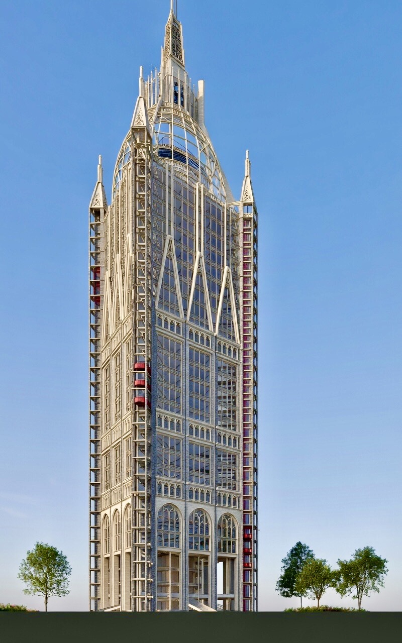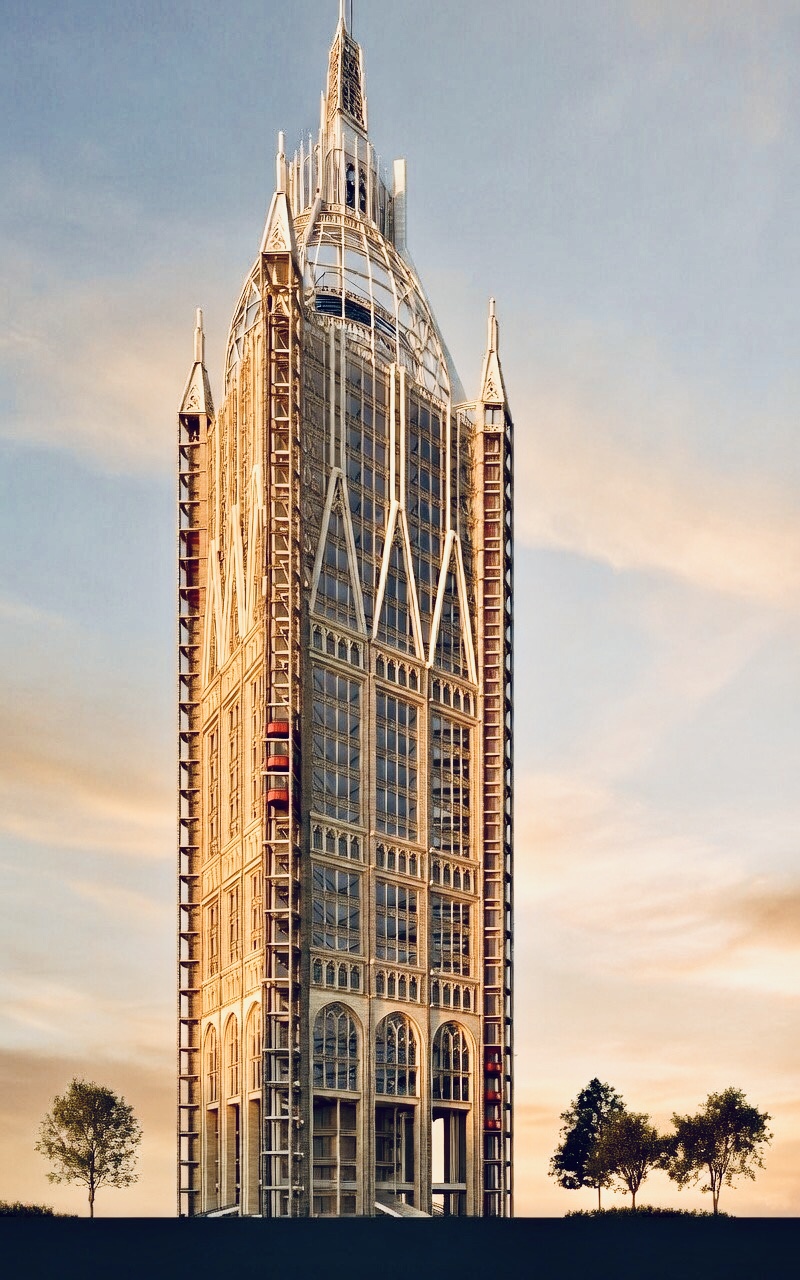 Depending on Location, The Proposal might work either as an Authentically Constructed Neo Gothic Tower (Loadbearing Stone elements combined with Steel for structural stability in places) , A Stone / Metal Clad Version with a Steel Superstructure, or Further downriver, a Fully Hi Tech Contemporary Expression of the Neo Gothic Form. Ai Powered Robotic Fabrication might be used to expedite and control the creation of much of the Proposed Facade embellishment whilst maintaining relative cost viability.