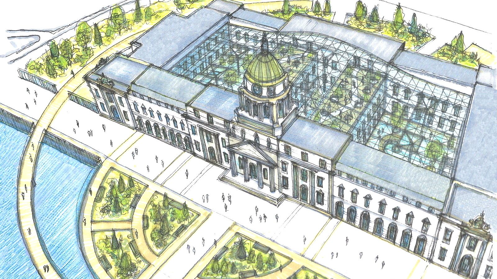 The Proposal suggests a New Subterranean Arrival Hall to Beresford Place housing Cloakrooms, Washrooms etc, with a Route under the Northern Facade under and up into the Courtyard in a manner similar to the Louvre by I.M. Pei. There is a Public Plaza and Classical Riverside Garden proposed in lieu of the existing Roadway to the Quayfront. A Riverfront Walkway is proposed , referencing the shape of a Celtic Torc / Torque with the widest section facilitating the congregation of pedestrians at the Riverfront. Outline suggestions followed for Liberty Hall as a Classical Tower and for the Reconfiguration of the Loop Line Bridge to allow for restoration of the view of the Customs House from O’Connell Bridge.