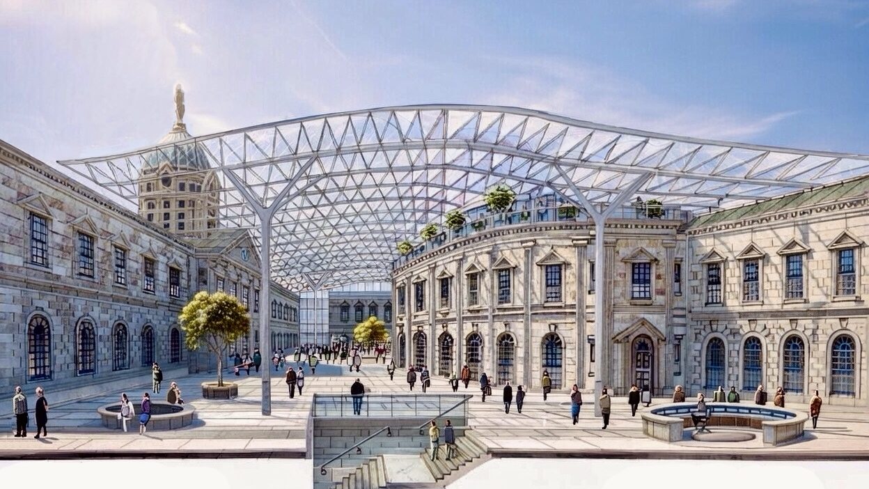 A subsequent variation was proposed where the Existing Courtyard arrangement would be entirely Re-Configured to allow for a Newly Constructed curved Central Feature in a Neo-Classical Style. This would result in a much Grander Public Space comparable in scale to the Great Court at the British Museum in London, and result in more straightforward circulation between the Courtyard and the Custom House Wings which would house most of the Archaeological Exhibits. It offers the possibility of Rooftop Space overlooking both the newly configured Courtyard and the Customs House Dome. This ‘Great Court’ arrangement sets up a dramatic entrance from below (subject to investigation of the Historic Raft Foundation) and an equally dramatic transition from the more intimate Southern Entrance for special events where more limited visitor numbers would be anticipated.