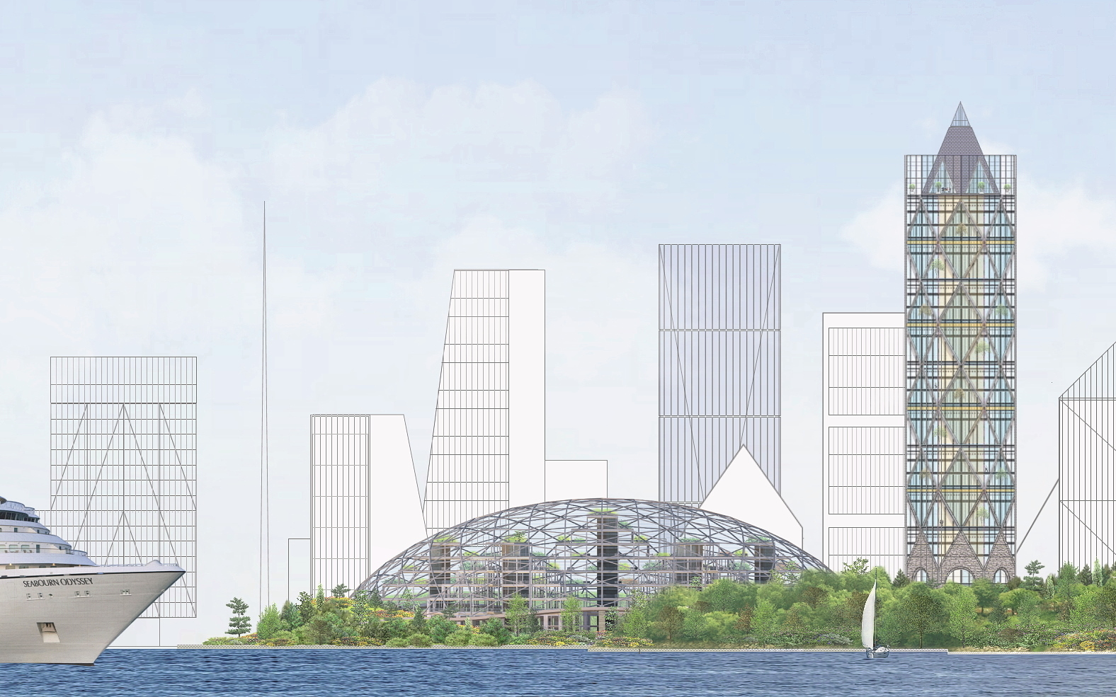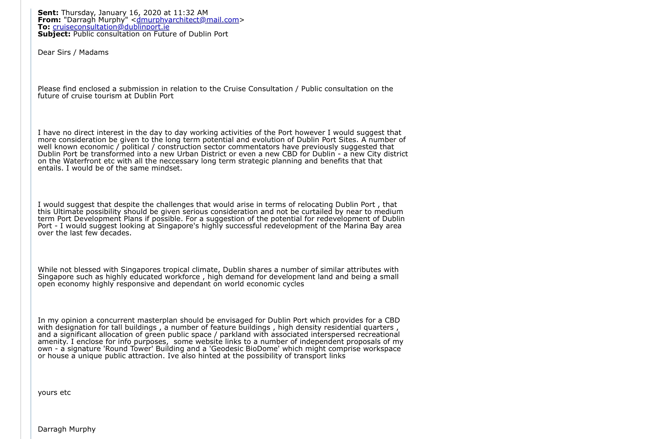 Design proposals for a Retail Destination – ‘Dublin Dome’, and a Landmark ‘Round Tower’ building, were previously published in 2017 and 2019. These were followed by contextual sketches in 2019 / 2020 suggesting a location in Alexandra Basin which were in illustrative form. The intention was to eventually produce something more coherent, which would put the Round Tower and Dublin Dome proposals in a proper context and also to suggest my personal view of the true potential for Alexandra Basin. These Proposals are influenced by frequent visits to Marina Bay in Singapore between 2012 and 2016. Alexandra Basin is a similar opportunity in my opinion, with potential for a mixed use CBD and a sense of enclosure arising from the pre existing shape of Alexandra Basin. Luas , Rail lines and Port Tunnel link to Airport are in situ nearby. River taxis can be introduced to link with City and coastal suburbs.