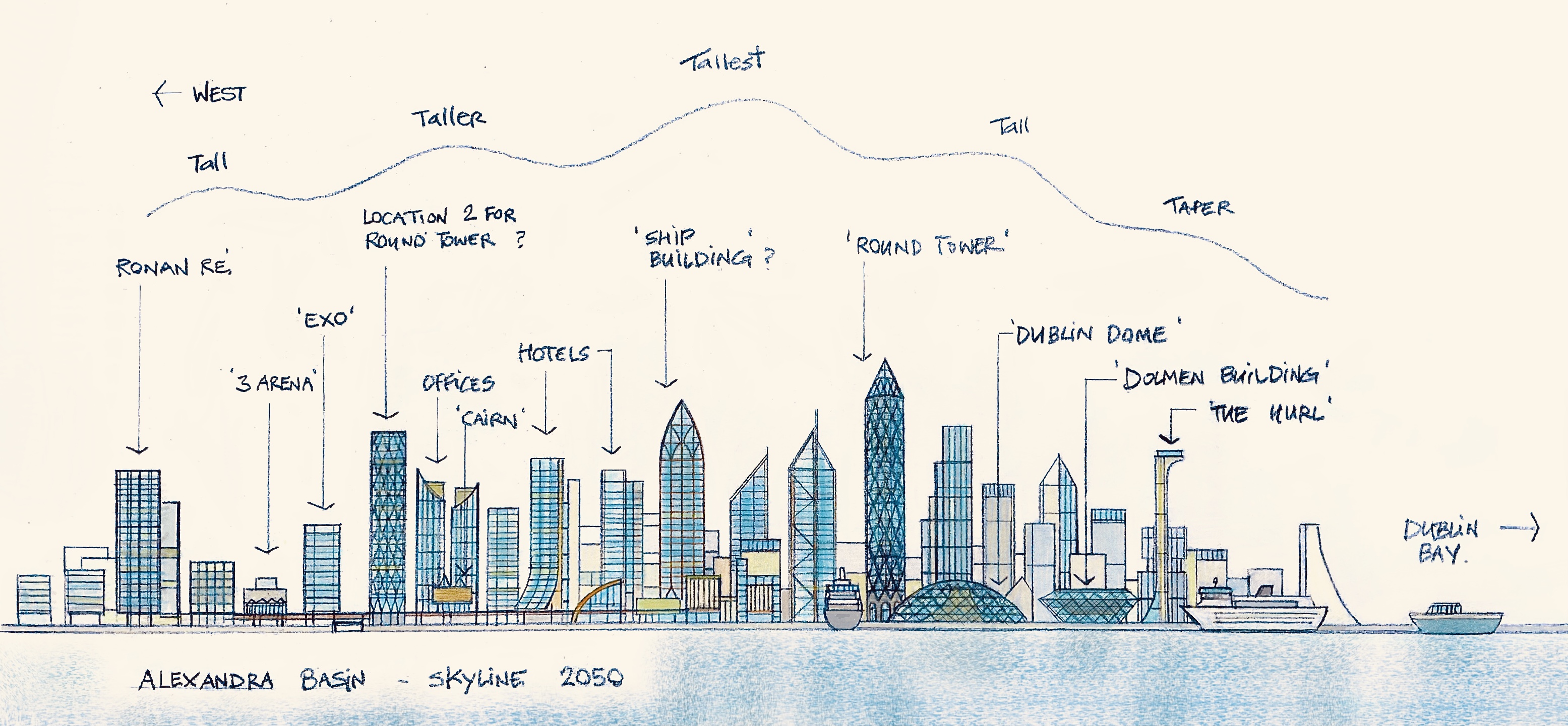 Large scale development of Alexandra Basin is not a new idea. The proposed development for this section of Dublin Port expands upon Options 4 and 5 of a DCC document published in 2007 – ‘A Vision for Dublin Bay’ where Minor relocation of Dublin Port was suggested. What I have done is to conceptualise and define a number of specific anchor buildings for this location which I believe, along with the Flour Mill masterplan by Grafton Architects, would strengthen the case for the viability of a mixed use Waterfront CBD. This is my personal view of the optimum development outcome for Alexandra Basin where Economic Catalysts & Cultural Contributions can co-exist