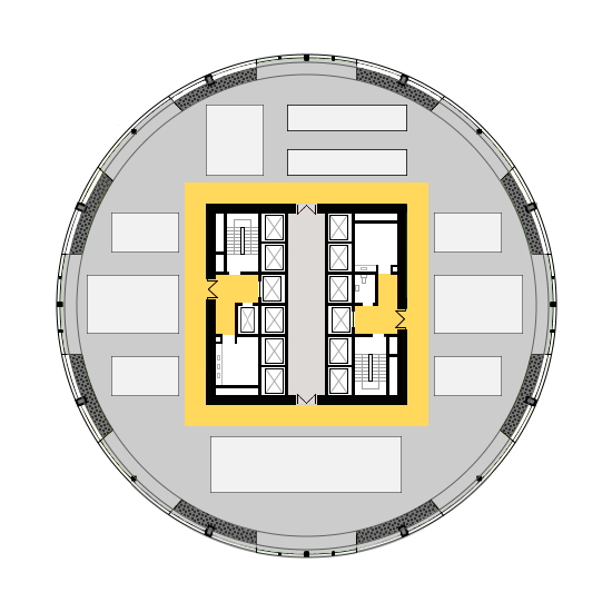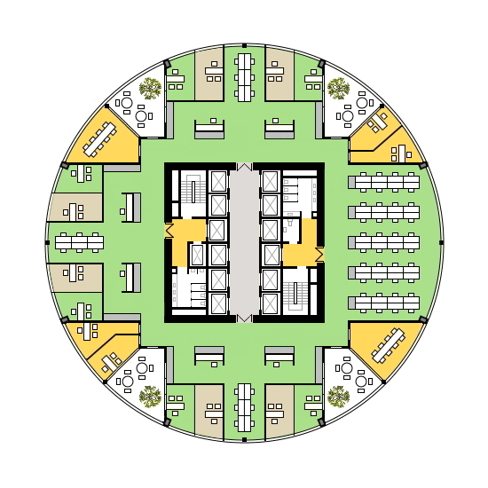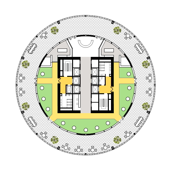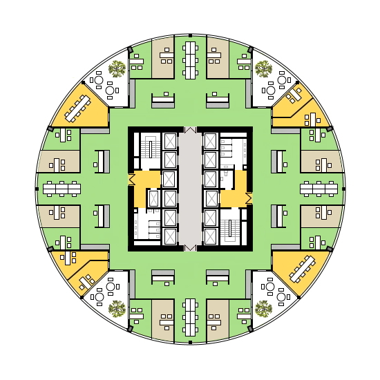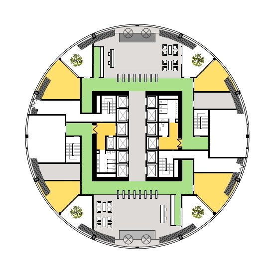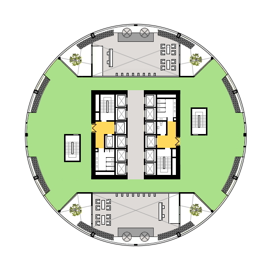 Building Apex : Cone shaped Diagrid comprising Triangular Sections each spanning 2 Floor Levels to Form Building Apex / Roof Area. Robotic Rotating Building Cleaning System at Junction of Coned Roof to Main Building Structure. Rooftop Lounge Bar / Dining Area subject to Vertical Circulation Programme. Subject to Vertical Circulation constraints ( Elevators ) , there is potential for a concentric Outdoor Deck and sheltered edge dining experience as shown in one of the earlier concept sketches with Shear Curtain wall glazing structure extending from Steel Diagrid structure below. Refer to Draft plan below of uppermost level with Rooftop Cafe / Bar.