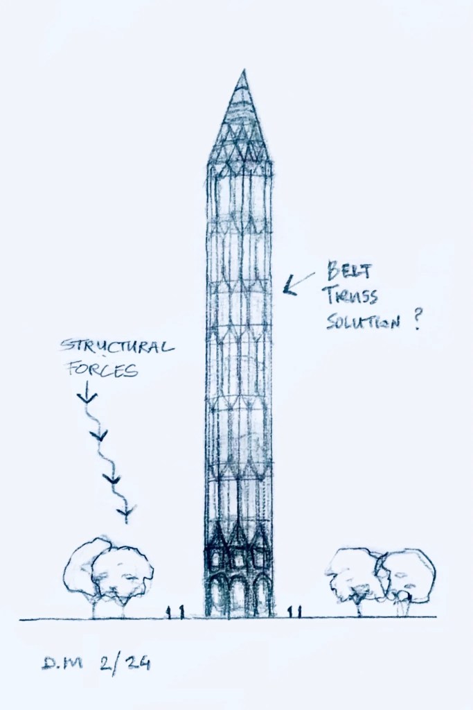 Potential Structural System : If Steel Tube Diagrid , then likely to be Triangular 3 Storey Sections subject to individual Steel Tube assembly, connected via Pre Cambered Steel Nodes with radial Steel Beams at each Floor Level connecting to Steel Columns within R.C. Core. Floor to Floor circa 4.0 metres. Horizontal Steel Perimeter hoops to restrain Diagrid at Building Perimeter & Deflect horizontal forces from Steel Nodes. Likely Floor system to be poured R.C. Concrete Slab on Profiled Metal Decking System with Raised access Floor.