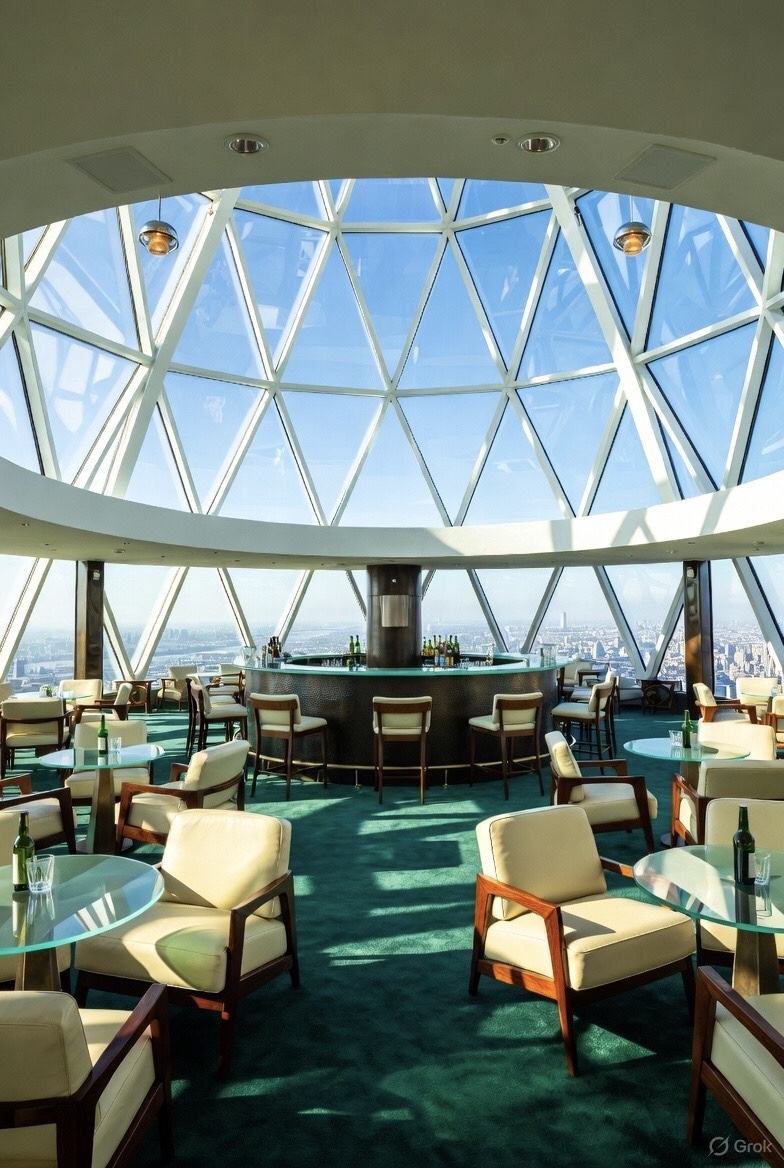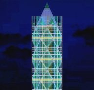 Building Apex : Cone shaped Diagrid comprising Triangular Sections each spanning 2 Floor Levels to Form Building Apex / Roof Area. Robotic Rotating Building Cleaning System at Junction of Coned Roof to Main Building Structure. Rooftop Lounge Bar / Dining Area subject to Vertical Circulation Programme. Damper provision subject to Structural Engineers recommendations.