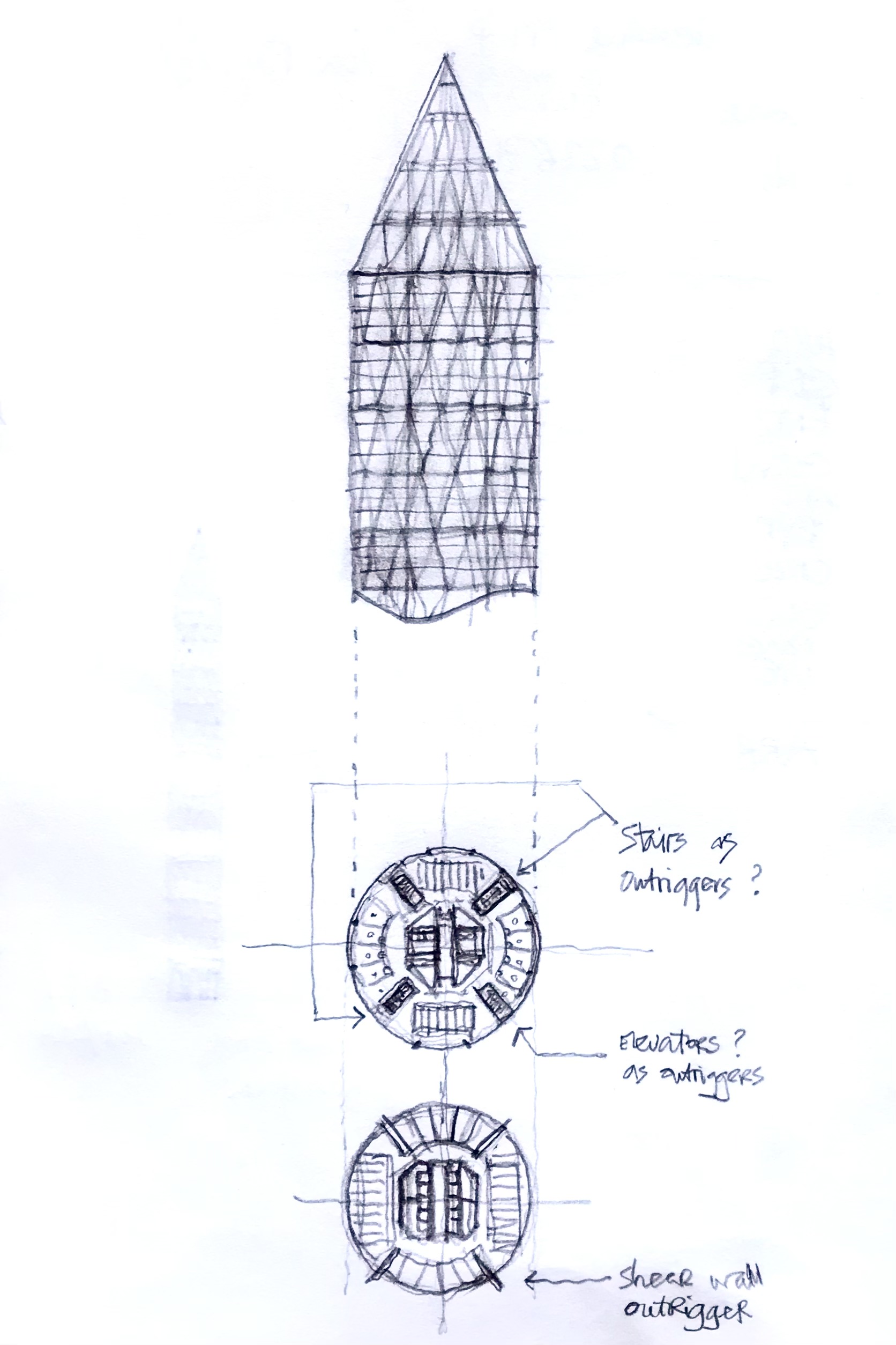 Alternatively, in lieu of Steel Diagrid System to Building Envelope, consider 4 Vertical RC + Steel Cores with Built in RC. Super Columns ( Outer Wall & inner RC Core) at 90 degree Orientations to give Cruciform shape in Plan with Smaller central Core reserved for Dedicated Vertical Transport to Apex of the Building. Likely Floor system to be poured R.C. Concrete Slab on Profiled Metal Decking System with Raised access Floor. May allow for Interesting Vertical Circulation possibilities compared to conventional Core.