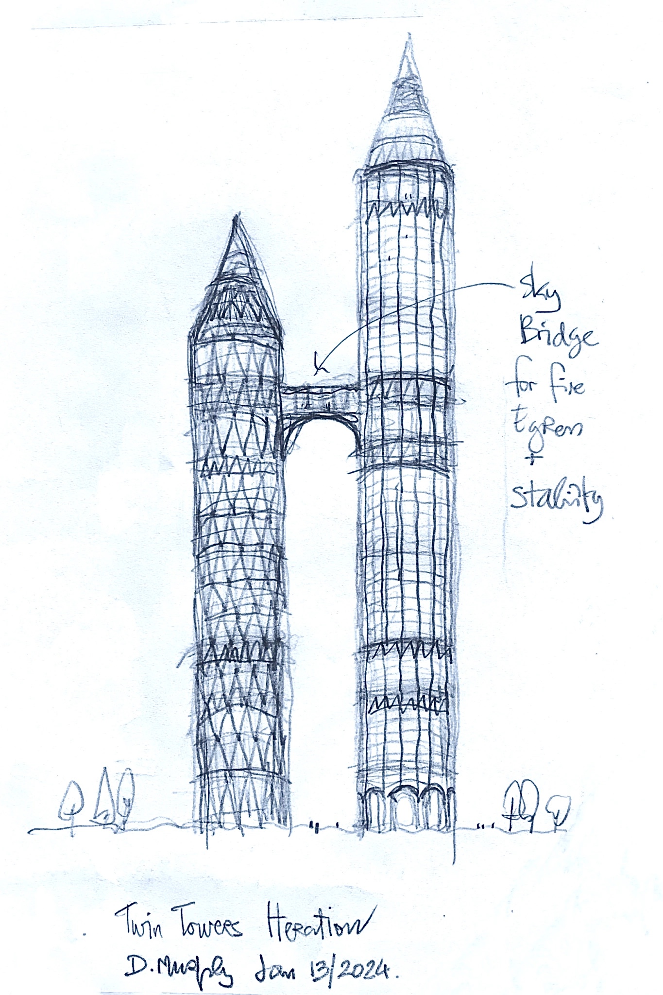 ‘Round Towers’ Twin Building Proposal – Tall + SuperTall Iteration – Sketch Perspective of Hypothetical Downtown Context
